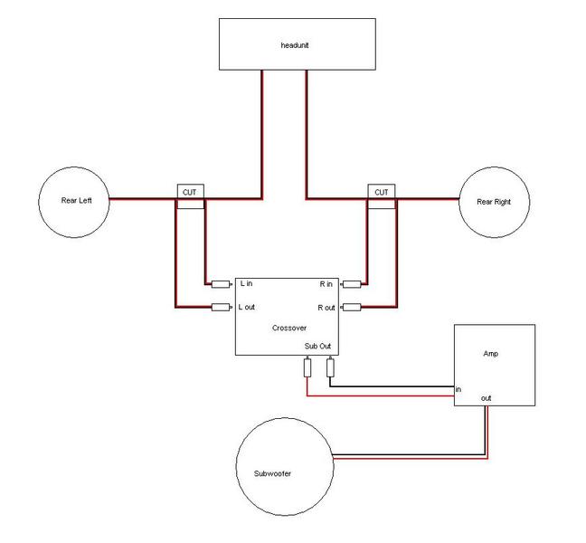 Mounting your head unit. Connect the subwoofer to the amp with speaker wires if they are separate. If the subwoofers line in uses rca cables and if the subwoofer out on the receiveramplifier also uses rca simply plug in using an rca cable. They show a typical single channel wiring scheme. Some amps have that feature built in called speaker level inputs so thered be no need for a separate little device. Check the amplifiers owners manual for minimum impedance the amplifier will handle before hooking up the speakers.