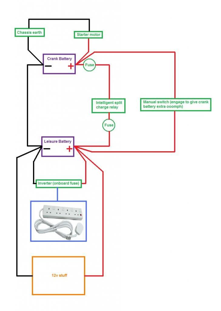 When your engine is switched off and the battery voltage drops below 128v the relay will isolate your leisure batterys from your main starter. You can probably even lift the battery out and place it on the ground without. In addition to charging the leisure batteries from the engine and solar energy i also have a hook up facility. It reveals the elements of the circuit as streamlined shapes and the power and also signal links between the gadgets. 1 for a 3 pin 240v socket for charging 240v devices and another to power the batteries via the leisure battery charger. A super simple wiring diagram on how a split charge device directs power towards the leisure battery one it has been engaged.